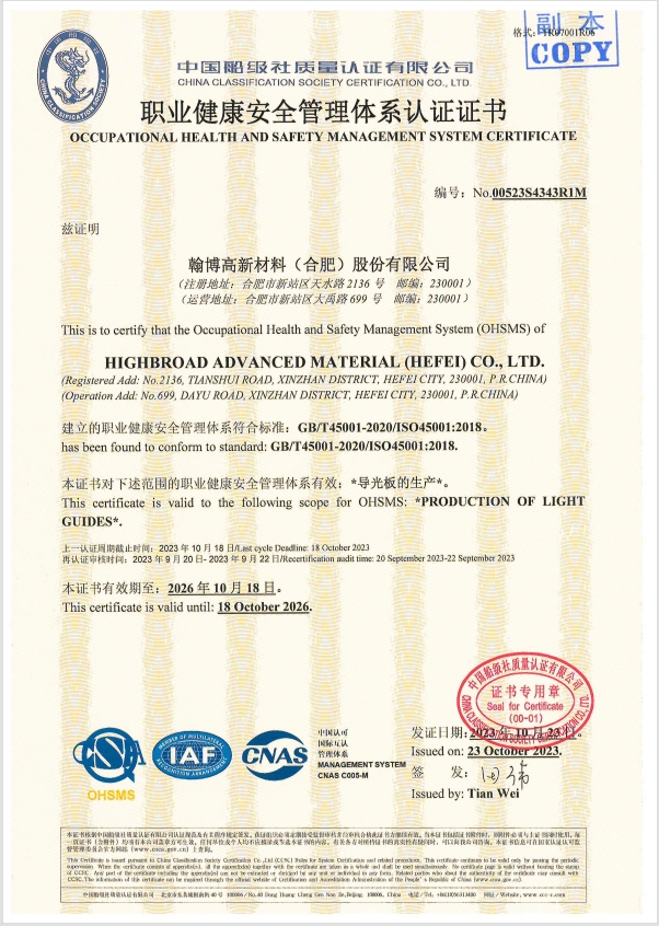 翰博簡介 企業(yè)文化 大事記 企業(yè)榮譽 專利證書 體系證書 體系證書 翰博簡介 企業(yè)文化 大事記 企業(yè)榮譽 專利證書 體系證書 翰博高新 合肥博訊 重慶博碩 滁州博晶 廣州歐訊 合肥星宸 重慶星宸 合肥領(lǐng)盛 合肥通泰 翰博高新-ISO45001 翰博高新-ISO14001 翰博高新-ISO9001 3條 首頁 1 尾頁 上一頁1 / 1 下一頁 股票代碼:301321 關(guān)于翰博 翰博簡介 企業(yè)文化 大事記 企業(yè)榮譽 專利證書 體系證書 產(chǎn)品中心 背光模組 導光板 光學膜片 膠粘類產(chǎn)品 精密結(jié)構(gòu)件 OLED OPEN MASK再生及制作 新聞動態(tài) 新聞報道 行業(yè)資訊 黨群工作 黨群活動 工會活動 投資者關(guān)系 部門聯(lián)系方式 公司公告 年度&季度報告 在線咨詢 0551-64380736 地 址:安徽省合肥市新站區(qū)大禹路699號 傳 真:0551-65751228 Copyright ©2022 翰博高新材料(合肥)股份有限公司 版權(quán)所有 | 網(wǎng)站備案/許可證號:皖I(lǐng)CP備2021016865號-1 皖公網(wǎng)安備 34019002600191號 友情鏈接|黨群工作|聯(lián)系我們
