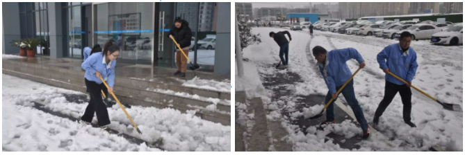 天亮了,上班路舉步維艱。大家?guī)缀跏腔械焦荆┖苊溃且矔?huì)給我?guī)碡?fù)擔(dān)。我們博訊廠區(qū)的廣場(chǎng)上鋪上了厚厚的積雪,給上班的同事們帶來了不便。行政人員第一時(shí)間組織人員進(jìn)行鏟雪,雖然當(dāng)時(shí)工具不齊全,但是輪番上陣也要融化這厚厚的雪。