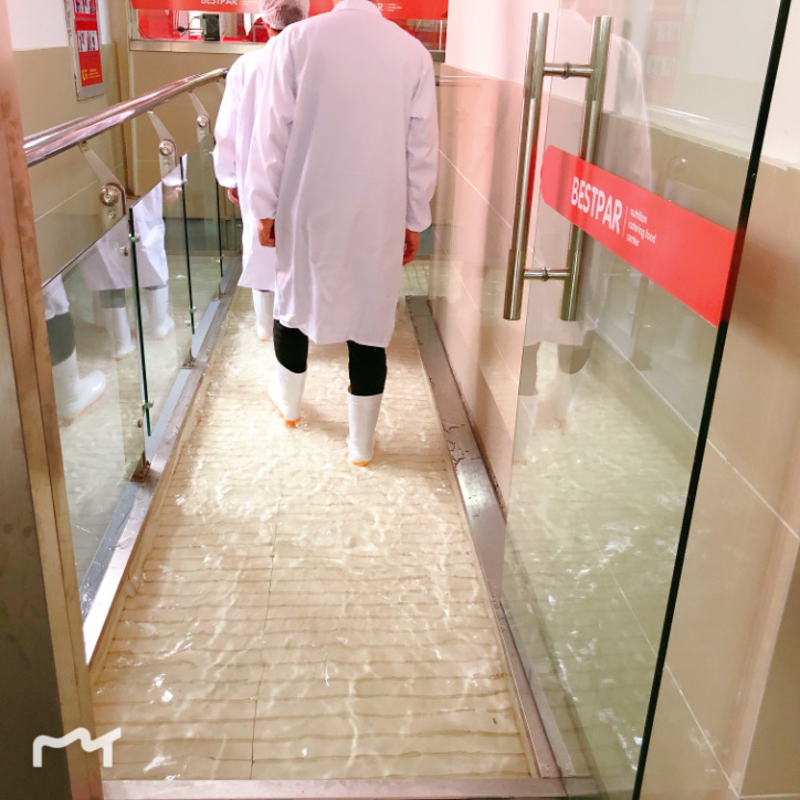 進入制餐中心,體溫檢測合格后,會進入消毒池,對鞋底進行消毒清洗,保證制餐中心的衛(wèi)生與整潔。